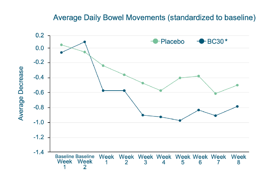 จากงานวิจัยในผู้ป่วยโรคลำไส้แปรปรวน จำนวน 55 คน พบว่าการกินโปรไบโอติกที่เป็นองค์ประกอบสำคัญของ Synbio Fiber เป็นเวลาต่อเนื่อง 8 สัปดาห์ มีการเคลื่อนที่ของลำไส้น้อยลง แสดงให้เห็นว่า ผู้ป่วยมีอาการท้องเสีย จากภาวะลำไส้แปรปรวนน้อยลง