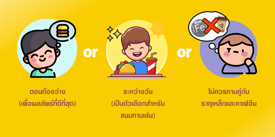 - ไม่ควรทานคู่กับธาตุเหล็กและคาเฟอีน