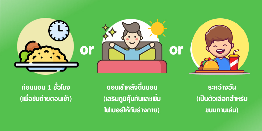 - ก่อนนอน 1 ชั่วโมง (เพื่อขับถ่ายตอนเช้า)