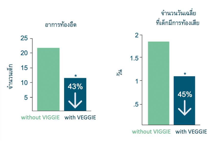จากงานวิจัยในเด็กอายุ 6-8 ปี พบว่าการกินโปรไบโอติก ที่เป็นองค์ประกอบสำคัญของ VIGGIE SYNBIO เป็นเวลาต่อเนื่อง 12 สัปดาห์ สามารถบรรเทาอาการท้องอืดลงไปได้กว่า 43% และทำให้เด็กมีอาการท้องเสียน้อยลงกว่า 45% เมื่อเปรียบเทียบกับเด็กกลุ่มที่ไม่ได้กินโปรไบโอติกที่เป็นองค์ประกอบของ VIGGIE SYNBIO