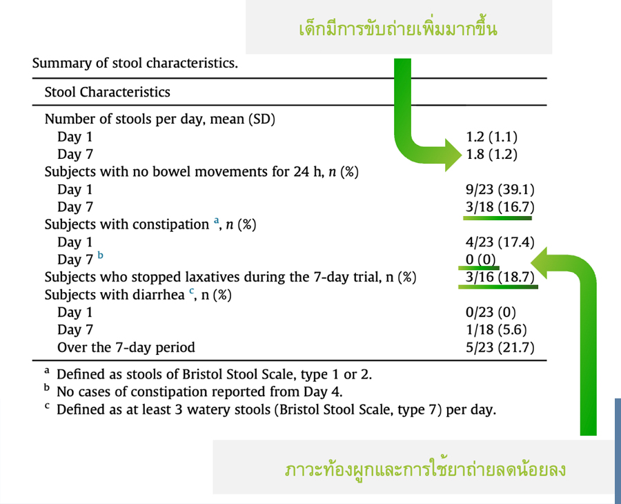 ช่วยบรรเทาอาการท้องผูก ทำให้เด็กมีการขับถ่ายเพิ่มขึ้น ลดการใช้ยาช่วยกระตุ้นการขับถ่าย