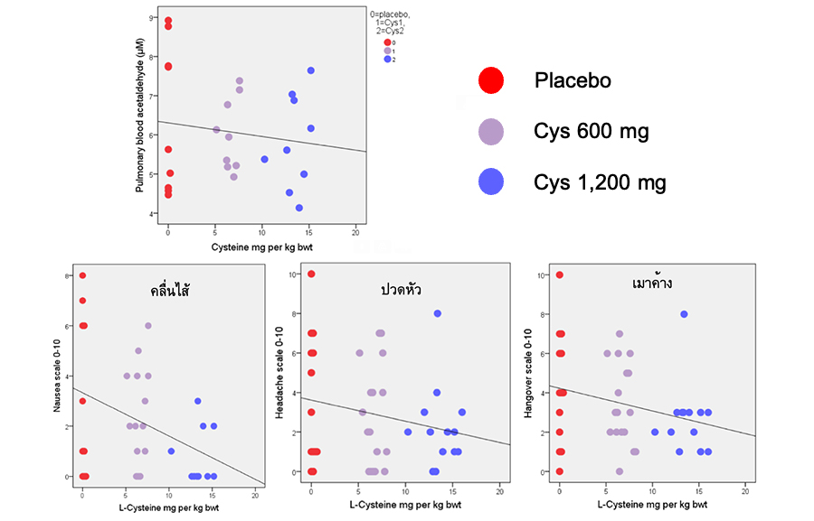เมื่อตรวจวัด Acetaldehyde ในกระแสเลือด พบว่ามีปริมาณลดต่ำลง ในอาสาสมัครกลุ่ม Cys 600 mg และ Cys 1200 mg ตามลำดับ เช่นเดียวกับอาการคลื่นไส้ (Nausea) อาการปวดหัว (Headache) และอาการเมาค้าง (Hangover)
