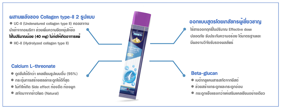 - มี UC-II™ คอลลาเจนนำเข้าจากอเมริกา เพิ่มความยืดหยุ่นให้กับข้อต่อ ปวดเข่าน้อยลง เหยียดเข่าได้มากขึ้น