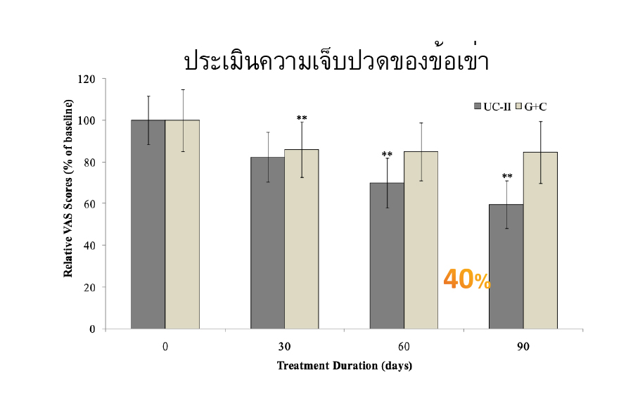 จากงานวิจัยในคนที่เป็นโรคข้ออักเสบ (Osteoarthritis) 40-75 ปี พบว่าเสริม UC-II 40 มิลลิกรัม/วัน ที่เป็นองค์ประกอบสำคัญของ CAL PLUS ช่วยบรรเทาอาการปวดข้อเข่าได้มากกว่าการเสริม Glucosamine 1500 มิลลิกรัม ร่วมกับ Chondroitin 1200 มิลลิกรัม/วัน
