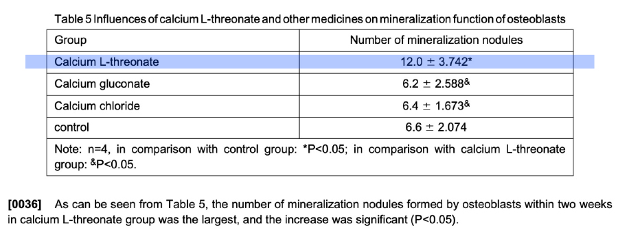 การทดลองในห้องปฏิบัติการ เพื่อดูการพัฒนาของเซลล์กระดูก (osteoblasts) จากการเสริมแคลเซียมในรูปฟอร์มต่าง ๆ จะเห็นว่า Calcium L-threonate มีค่า Number of mineralization nodules มากกว่า แคลเซียมรูปฟอร์มอื่น แสดงให้เห็นว่า Calcium L-threonate ดูดซึมและนำแคลเซียมไปพัฒนากระดูกได้ดีที่สุด