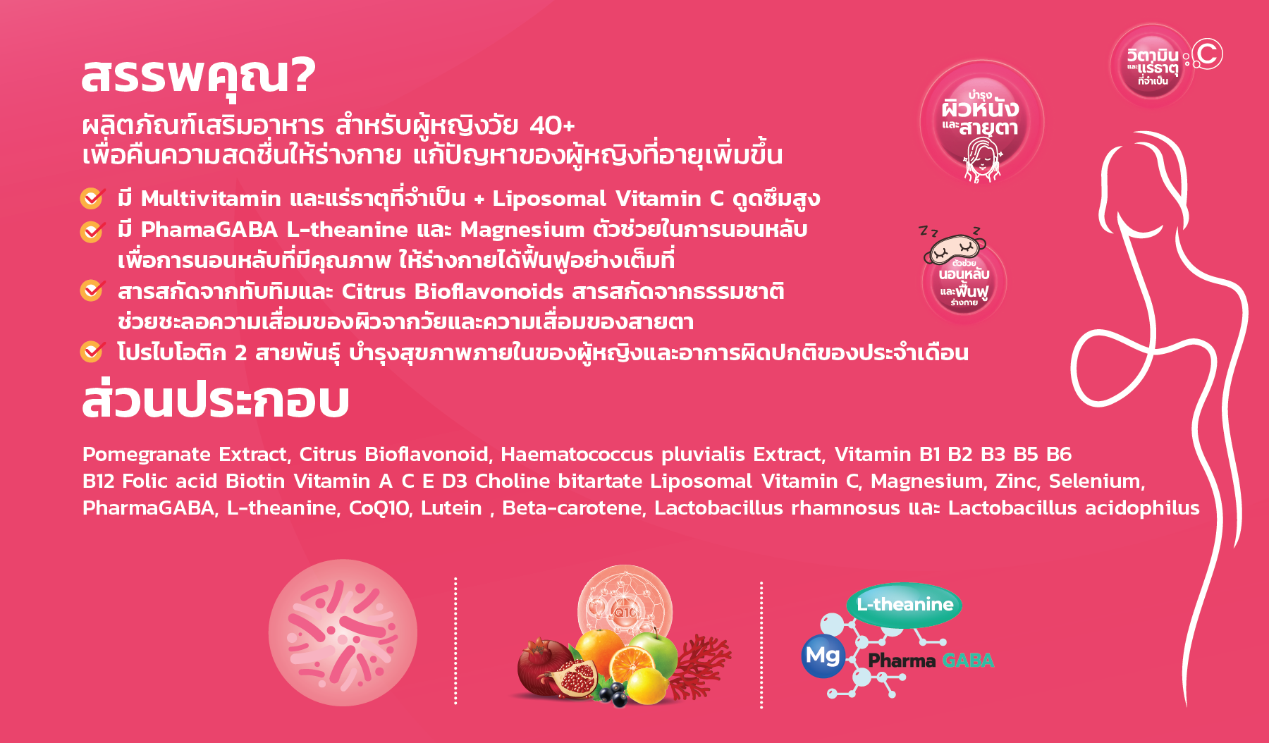ผลิตภัณฑ์เสริมอาหาร สำหรับผู้หญิงวัย 40+ ผิวหนังและสายตาเพื่อคืนความสดชื่นให้ร่างกาย แก้ปัญหาของผู้หญิงที่อายุเพิ่มขึ้น